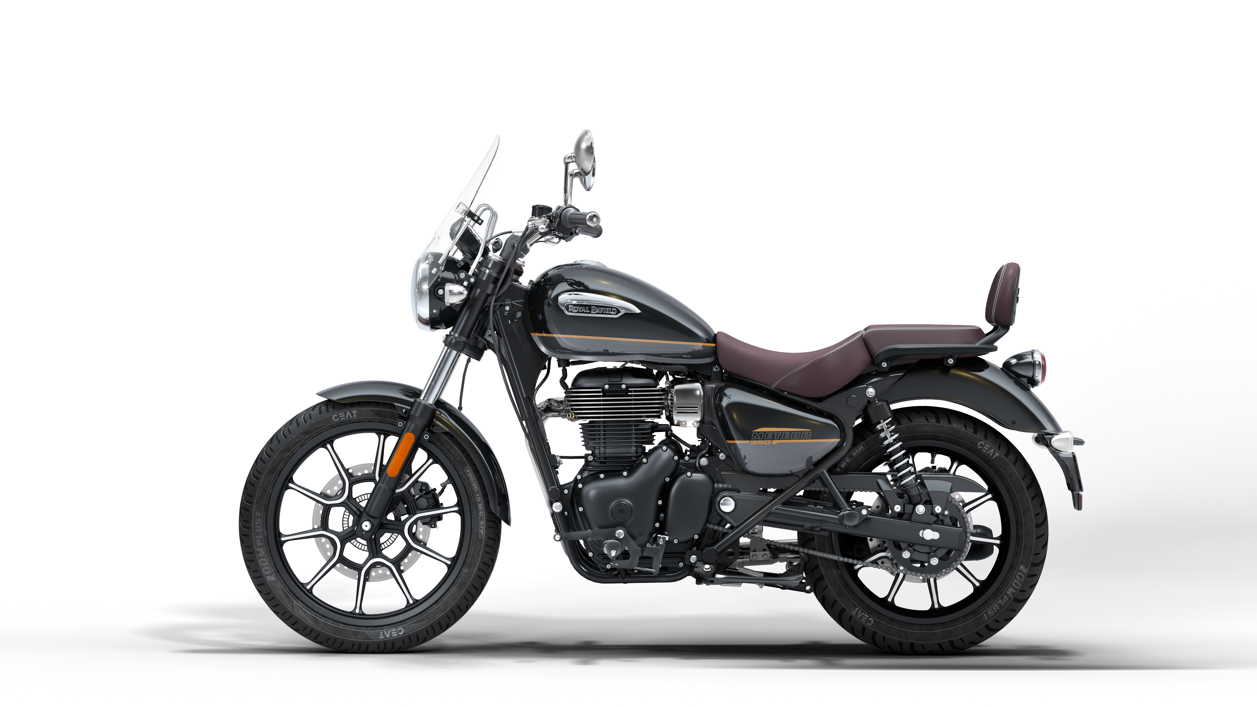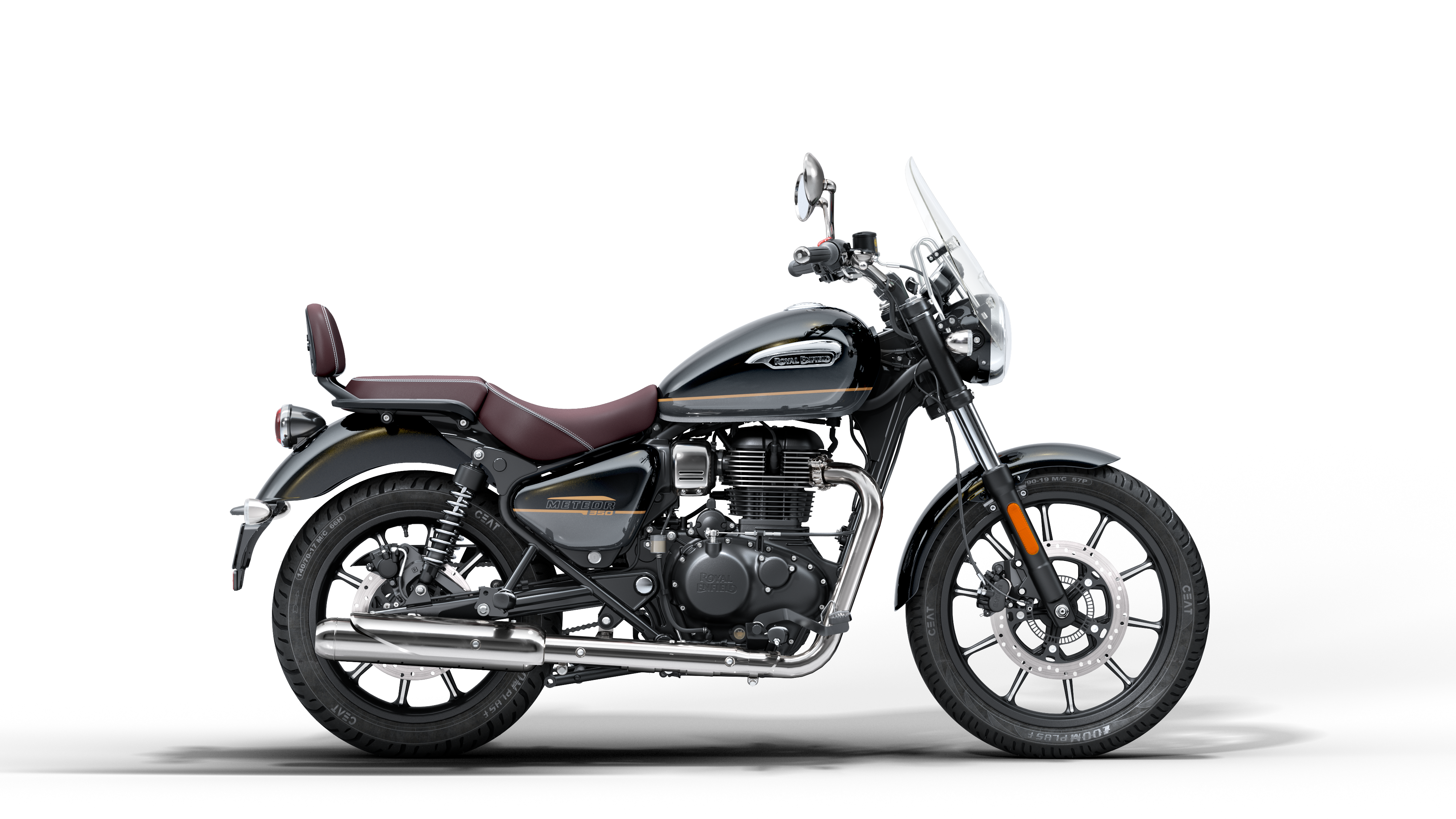 Die Meteor 350 wurde von Grund auf für Komfort entwickelt. Die niedrige Sitzhöhe von nur 765 mm und die nach vorne verlegten Fußrasten sorgen für die klassische, entspannte Cruiser-Sitzposition. Ihr Twin-Downtube-Rahmen bietet ausgezeichnete Stabilität und leichte Lenkbarkeit, damit du stundenlang ohne Ermüdung cruisen kannst.